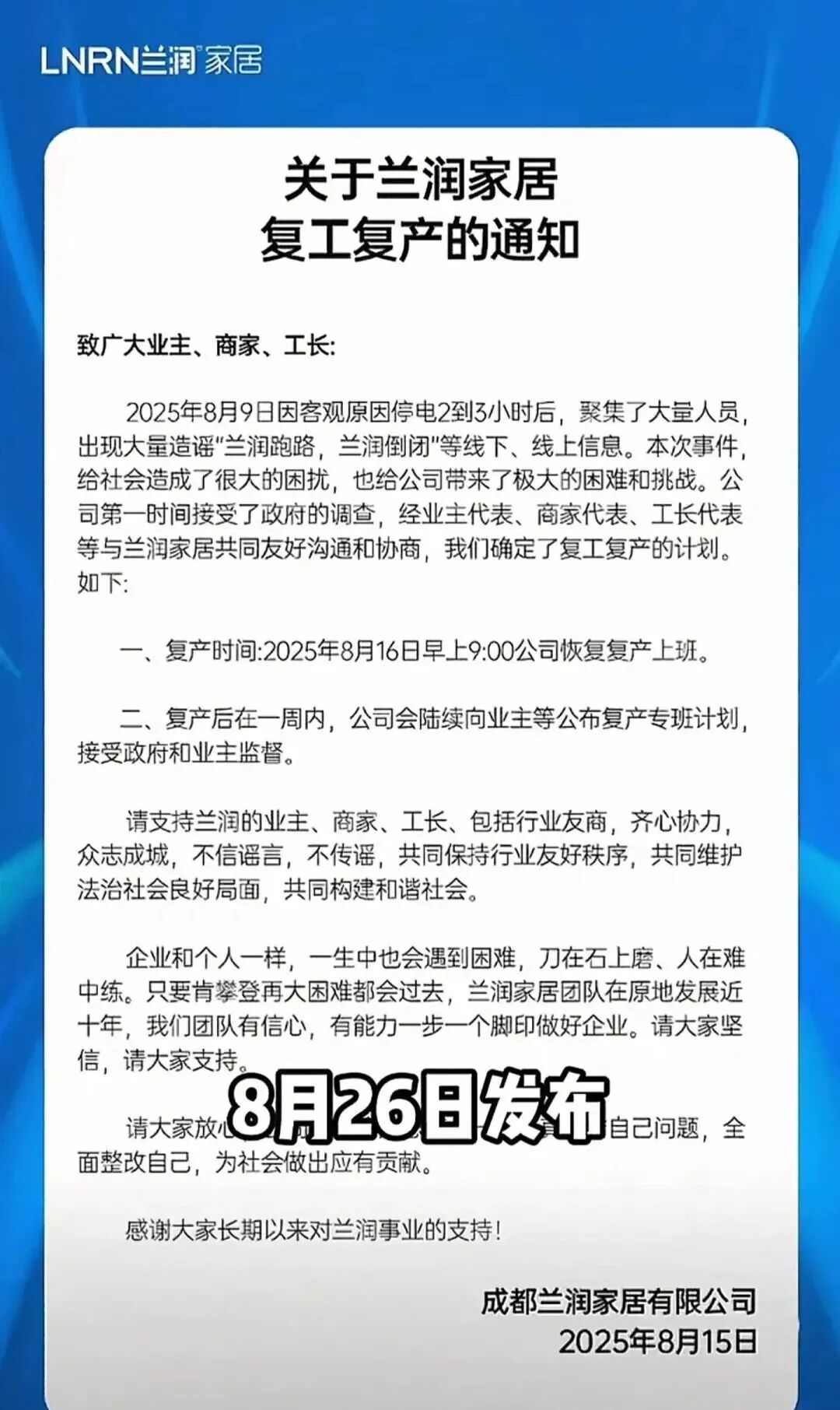 此前,公司负责人曾承诺于8月26日公布复工复产计划,但截至目前仍未有任何明确进展,众多业主表示求助无门,面临财产损失与装修困局。